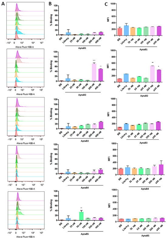 Analysis of the binding capacity of the aptamer panel for the MDA-MB-231 strain. Histogram illustrating the percentage of cells incubated with binding buffer solution, initial library, and increasing doses of AptaB1–AptaB5 (A). Graphical representation of the mean percentage of binding of AptaB1–AptaB5 aptamers (B). Graphical representation of the average MFI (C). * p < 0.05, ** p < 0.01, *** p < 0.001.
