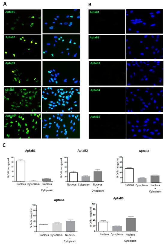 To validate the recognition and specificity of the aptamers, we used the aptaflurescence technique, in which the aptamers were incubated with MDA-MB-231 and MCF-10A, and the number of recognized cells was quantified. The MDA-MB-231 cells were recognized by all five aptamers (Figure 3A). The subcellular localization of the aptamers was distributed as follows: AptaB1 labeling was predominantly in the nucleus, as 85% was observed in the nucleus only, 12% in the nucleus and cytoplasm, and 3% in the cytoplasm only. The AptaB2 intracellular localization was distributed as 40% in the nucleus and cytoplasm, 32% in the nucleus only, and 27% in the cytoplasm only. AptaB3 was observed at 42% in the nucleus and cytoplasm, 37% in the nucleus only, and 21% in the cytoplasm only. AptaB4 was observed at 47% in the nucleus and cytoplasm, 34% in the nucleus only, and 18% in the cytoplasm only. Finally, AptaB5 labeling was observed at 55% in the nucleus, 27% in the nucleus and cytoplasm, and 17% in the cytoplasm only (Figure 3A,B). In addition, the cytoplasmic labeling of AptaB2, AptaB3, and AptaB4, presented a punctual profile. Moreover, we observed the absence of staining in the non-tumoral MCF-10A cells (Figure 3B).
