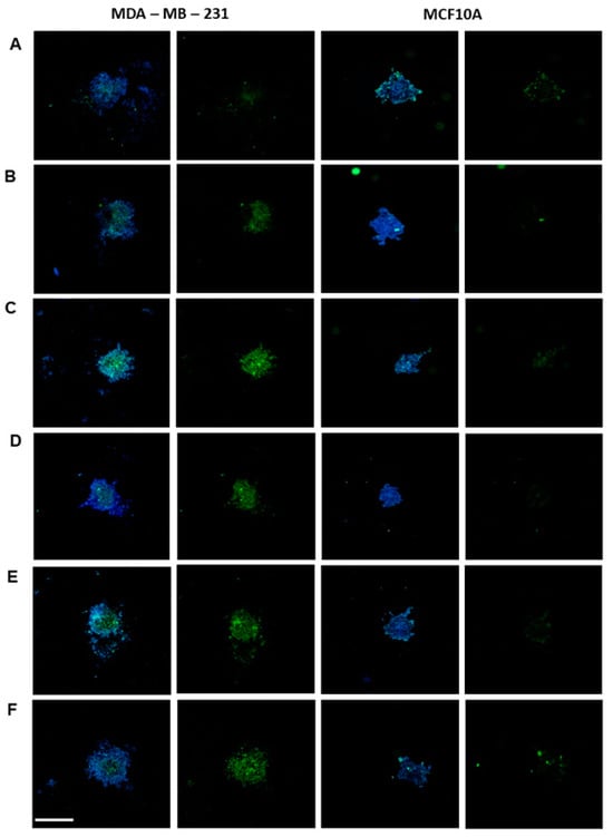 Aptafluorescence assay in a three-dimensional culture model. Core in blue (DAPI); aptamer conjugated to FAM in green. (A) Aptamer library, (B) AptaB1, (C) AptaB2, (D) AptaB3, (E) AptaB4, and (F) AptaB5. The images were obtained using imagexpress Micro Confocal equipment in a 10× objective. Bar = 200 µM.