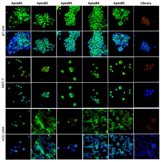 Evaluation of the detection capacity of aptamers in cell lines of the luminal A, luminal B, and HER2+ molecular subtypes. Aptafluorescence assay with the aptamers AptaB1–AptaB5 or with the starting library—FAM (green) using MCF-7 (luminal A), BT-474 (luminal B), and HCC-1954 (HER2) cell lines; nucleus stained with DAPI (blue). Representative images of the library—FAM recognition. Overlay of the library—FAM recognition image and DAPI nucleus stain.