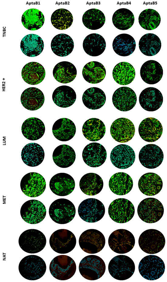 Validation of MD1–MD5 aptamer recognition in breast cancer samples using the tissue microarray technique (TMA). Triple-negative breast cancer (TNBC), HER2+ subtype (HER2+), luminal subtype (LUM), lymph node metastasis (MET), and adjacent normal tissue (NAT). Aptamers AptaB1–AptaB5 (green); cell nucleus stained with DAPI (blue).