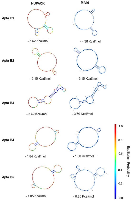 For most aptamers, the mFold and NUPACK free energy values differed somewhat, indicating differences in the predicted stability of the 2D folds. The one exception was AptaB2, for which both servers calculated identical free energies of −6.15 kcal/mol. This implies that the servers predicted the same minimum free energy 2D structure for AptaB2 (Figure 8).