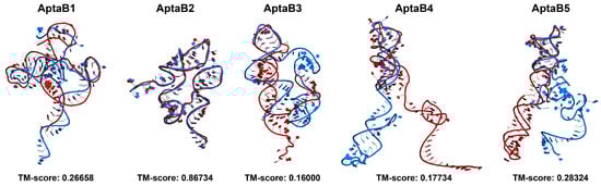 Comparison of the predicted tertiary structures of aptamers obtained with RNAcompose with 2D structures predicted using the mFold and NUPACK servers. Aptamer models generated from mFold 2D structures are shown in blue, while models generated from NUPACK are shown in red. Structural alignment and calculation of TM scores were performed using the RNA-align server to quantitatively assess the similarity between the 3D models from the two sources. Tertiary structure visualizations were generated using Pymol.