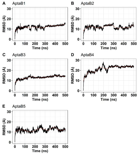 Analysis of conformational changes in structures during molecular dynamics simulation. The root mean square deviation (RMSD) is shown in Angstrons at the left, while the simulation time is given at the bottom. Black lines indicate the RMSD, while the shaded red line shows the tendency of the graph. (A): the RMSD of APTAB1 oscillated between 6 and 16 Å. The greatest variations happened between 30 ns and 300 ns. After 300 ns the RMSD stabilized around 13 Å and rose steadily until 16 Å. (B): The RMSD of AptaB2 did not stabilize throughout the simulation time. (C): AptaB3 was the less unstable aptamer among all 5. The RMSD of AptaB3 fluctuated around 14 Å and varied less than 4 Å for most of the simulation. (D): AptaB4 was quite unstable in the first half of the simulation, reaching 20 Å before the first 50 ns. Around 250 ns it stabilized near 24 Å and kept oscillating less than 4 Å until the end. (E): The RMSD of AptaB5 fluctuated around 13 Å, but showed great variations, reaching nearly 17 Å on its highest peak.