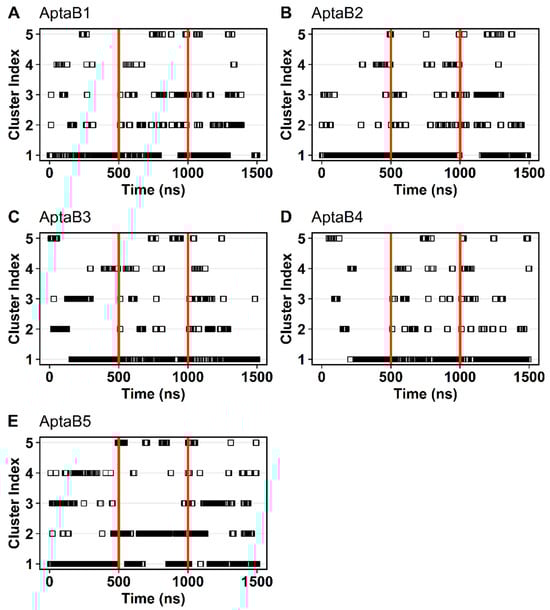 Clusters analysis based on the change in RMSD. Each cluster represents a group of conformations assumed along the molecular dynamic trajectory with AptaB1–AptaB5. The five biggest clusters are shown for each aptamer. Time is given at the bottom, while the cluster index is given at the left. Each structure is shown as a square. Black horizontal bars indicate a high density of squares grouped. Red vertical lines delimit the simulation time of the three replicates. (A): The five biggest clusters of AptaB1. The most expressive cluster comprises the three replicates indicating only one representative structure for the whole simulation. (B): Among the five biggest clusters of AptaB2, the cluster 1 also comprises the three replicates and appears as the most significant in all of them. (C): Cluster 1 in also the most expressive cluster in all three replicates of AptaB3. However, in the first 200 ns cluster 2 and cluster 3 are more frequent than cluster 1. (D): Among the five biggest clusters of AptaB4, cluster 1 is the most frequent cluster in all three replicates. However, in the first 250 ns, the conformations are clustered in several other cluster in despite of cluster 1. (E): The five biggest clusters of AptaB5. The cluster 1 is more frequent in the replicates 1 and 3, however, in the simulation time between 500 ns and 100 ns (corresponding to replicate 2) the cluster 2 is the biggest cluster formed. This result indicates the existence of two stable conformations for this aptamer.