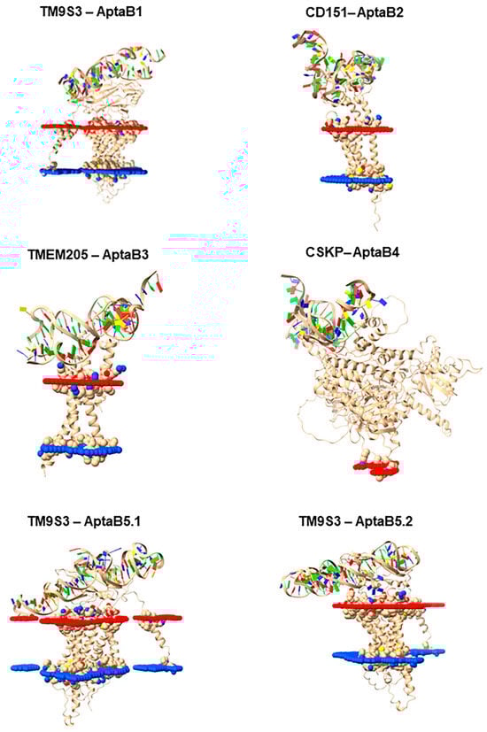 The best binding complexes for potential aptamer targets. Image representing the best clusters from the molecular docking step for the TMPS3–AptaB1, CD151–AptaB2, TMEM205–AptaB3, CSKPAptaB4, TM9S3–AptaB5.1, and TM9S3–AptaB5.2 complexes. For the spatial orientation, the red portion indicates the extracellular region and the blue portion indicates the intracellular region.