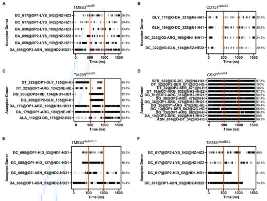 Hydrogen bond occupancy between the aptamer and the protein. The interacting pair of atoms are shown on the left, while the percentage of hbond occupancy is given on the right. The simulation time is shown in ns at the bottom. Horizontal black bars indicate each point of the simulation time that the interactions happened, whereas vertical red bars delimit each replicate time. Only hbond occupancies with 20% length or more are shown. (A): The binding of TM9S3 with AptaB1 is held mostly by the pair DA 659 and ASN 166. This interaction happens in all the replicates and covers 68.8% of the simulation time. 5 other weaker interactions above 20% hbond occupancy help to stabilize the binding throughout the simulation time. (B): In CD151AptaB2 there are just four interacting pairs with hbond occupancies over 20%, whereas the highest one happens for only 30.8% of the simulation. In several points of the simulation time there are no interaction happening at all. (C): In TM205AptaB3 There are 7 interacting pairs above 20% hbond occupancy. However, four of them does not happen in one of the replicates. (D): The system CSKPAptaB4 stands out in terms of hbond occupancy since its 12 higher hbond occupancy values are above 95%. (E): TM9S3AptaB5.1 formed 4 hbond with over 20% occupancy. Two of those hbonds does not happen in one of the replicates so the pair DA 606 and ASN 53 held the interaction for most of the time (74.4%). (F): similarly to TM9S3AptaB1, TM9S3AptaB5.2, also formed 4 hbond with over 20% occupancy and two of them also involved the same residues, ASN 53 and HID 52, being the former part of the most stable interacting pair (DC 617-ASN 53: 74.2%).