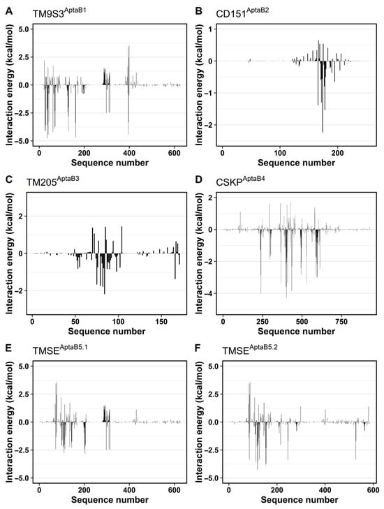Decomposition of ΔGbind. The individual contribution of each residue to the total energy is depicted as vertical black bars. Negative energy values stand for residues working in favor of the binding process, while positive values denote residues disturbing the interaction. (A): Several residues are contributing to the binding of TM9S3 with AptaB1 reaching near 2.5 Kcal/mol. Contrastingly, highly positive energies are observed, particularly between residues 60 and 80. (B): Most of the residues in CD151 has nearly insignificant participation in the interaction with AptaB2. Despite showing some residues with highly negative energies, the number of residues repealing the ligand is superior, which resulted in the less negative ΔGbind observed among all the systems. (C): In TM205AptaB3 the number of negative energies overcomes the positive ones. Besides the residues with positive energies do not reach 1.5 kcal/mol. (D): The system CSKPAptaB4 has considerably more residues with negative energies than residues with positive energies. Besides, several residues are reaching −3 kcal/mol, while a few one’s overpass −4 kcal/mol. In contrast, the most positive energies do not reach 2 kcal/mol resulting in a deeply negative ΔGbind. (E): TM9S3AptaB5.1 has some similarities with TM9S3AptaB1. However, the negative contributions and positive ones have lower absolute values. (F): TM9S3AptaB5.2 is like TM9S3AptaB1, but with higher absolute values. The residues with the most negative energies in TM9S3AptaB5.2 reached −5 kcal/mol almost while in TM9S3AptaB5.1 the most negative energies are close to −2.5 kcal/mol.