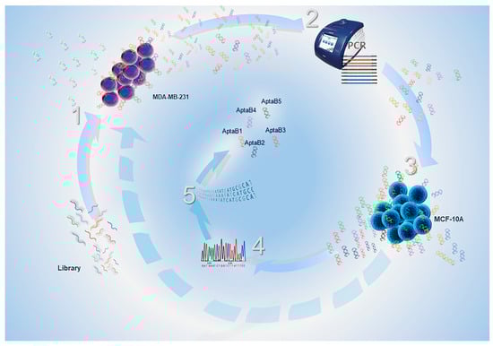 Breast cancer is a serious public health problem, and the aim of the present work was to identify specific aptamers for this tumor type with potential diagnostic function. Currently, the diagnosis of the disease is made by searching for receptors present in the tumor cell membrane (ER, PR, and HER2), which allows the classification of tumors into four major molecular subtypes []. Tumors expressing the hormone receptors ER and PR or the growth factor HER2 benefit from targeted therapies, and the triple-negative subtype is treated with cytotoxic chemotherapy and, in some cases, immunotherapy [,]. However, in clinical practice, the molecular classification based on these three receptors is not sufficient to define a more accurate diagnosis and prognosis, mainly for the triple-negative subtype []. The study of ssDNA aptamers capable of detecting the disease can serve as a tool to complement the currently used diagnosis, and the identification of the aptamer’s targets could be used as new TNBC biomarkers, thus developing strategies for personalized therapy.