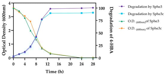 Graphical representation of growth profiles and 4-HBA biodegradation by P. phenanthrenivorans Sphe3 and Sphe3c strains. The growth of both strains was measured using optical density at 600 nm while biodegradation rate of 4-HBA in the culture medium by the respective strains was measured using HPLC, expressed as percentage (%) of remaining 4-HBA concentration at various time points.
