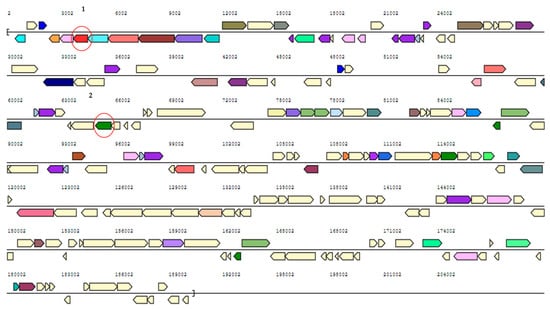 Map of pASPHE301 plasmid from P. phenanthrenivorans Sphe3. Marked with red circles are catabolic genes that concern the present study. 1: gentisate 1,2-dioxygenase (gdo12, Asphe3_39840), 2: catechol 2,3-dioxygenase (cdo23, Asphe3_40510). The plasmid map was extracted from the Joint Genomic Institute (JGI) database (https://img.jgi.doe.gov/cgi-bin/m/main.cgi?section=TaxonDetail&page=taxonDetail&taxon_oid=650377905#genomedetail2) (accessed on 22 July 2023).