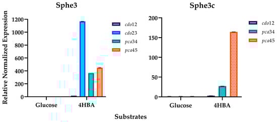 Transcription quantification for the genes involved in the biodegradation of 4-HBA in P. phenenthrenivorans Sphe3. The studied genes are coding for catechol 1,2- and 2,3- dioxygenases (cdo12 and cdo23, respectively) and PCA 3,4- and 4,5-dioxygenases (pcd34 and pcd45) monitored using RT-qPCR in Sphe3 and Sphe3c cells grown on glucose and 4-HBA, each as the sole carbon and energy source. Values represent the mean relative gene expression normalized to the housekeeping gene gyrβ ± standard deviations of three individual replicates. Gene expression levels in glucose were used as a calibrator.
