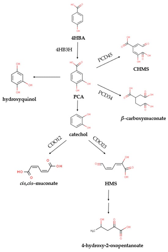 Aerobic biodegradation of 4-HBA varies depending on the bacterial species. Generally, a 4-HBA-3-monooxygenase-hydroxylase (4HB3H, pobA) hydroxylates 4-HBA to protocatechuate (PCA), which can then undergo oxygenolytic cleavage by PCA 3,4-dioxygenase (PCD34) to form β-carboxy-cis, cis-muconate [4], or by PCA 4,5-dioxygenase (PCD45) to form 4-carboxy-2-hydroxymuconate semialdehyde [6]. Both products are funneled in the tricarboxylic acid cycle. There have also been reports about the alternative pathways of decarboxylation of PCA toward the formation of either hydroxyquinol in Rhodococcus jostii RHA1 and Agrobacterium sp. [28], or catechol in Klebsiella pneumoniae [29], Klebsiella aerogenes [30], Clostridium hydroxybenzoicum [31] and Enterobacter cloacae [32]. Catechol can then undergo the oxygenolytic cleavage of the aromatic ring via meta-fission (catalyzed by catechol 2,3- dioxygenase, CDO23) or ortho-fission (catalyzed by catechol 1,2-dioxygenase, CDO12) to form 2-hydroxymuconic semialdehyde or cis,cis-muconic acid, respectively [25,33].