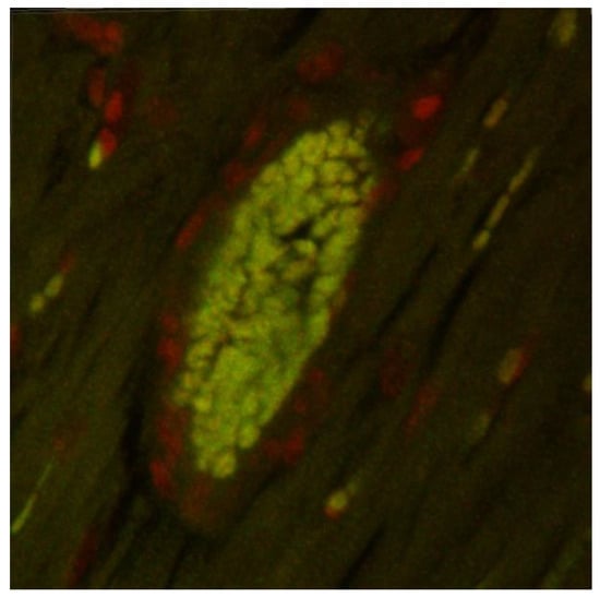 Figure 1 shows a myocardium with a coronary artery in a 3D reconstruction 24 h after the administration of coumarin-labeled nanoparticles. Coumarin-labeled nanoparticles, visible in green fluorescence, were evident in cardiomyocytes and vessel walls, and the strongest signal was in erythrocytes.