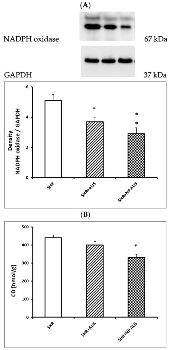 NADPH oxidase protein expression (A) and conjugated diene—CD concentration (B) in the heart of control group—SHR, powdered aliskiren group—SHR+ALIS, and aliskiren-loaded nanoparticle group—SHR+NP ALIS, * p < 0.05 vs. SHR, ** p < 0.01 vs. SHR.