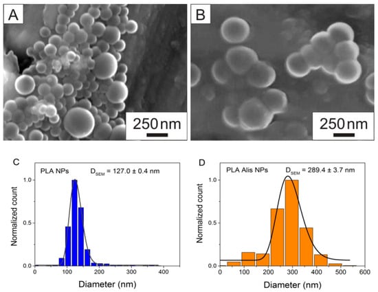 SEM images of blank polymeric nanoparticles—PLA NPs (A) and aliskiren-loaded polymeric nanoparticles—PLA Alis NPs (B) and corresponding size distributions (C,D), D—diameter.