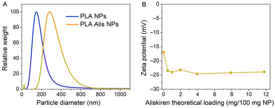 Size distribution of blank polymeric nanoparticles—PLA NPs and aliskiren-loaded polymeric nanoparticles—PLA Alis NPs as measured by differential centrifugal sedimentation—DCS (A); zeta potential of nanoparticle as a function of aliskiren concentration (B).