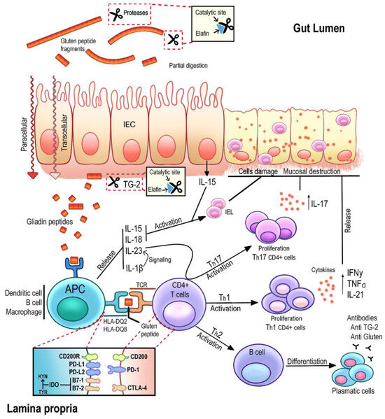 Celiac disease (CD) is an autoimmune condition that arises from gluten sensitivity in genetically predisposed individuals [1,2,3]. It is a complex disorder in which genetic, environmental and immunological factors converge [4,5]. Tolerance to dietary antigens is linked to the activation of regulatory T cells and the production of immunosuppressive cytokines, preventing inappropriate responses from effector Th lymphocytes [6]. Gluten consumption by individuals with CD triggers a sequence of inflammatory reactions that result in the characteristic small intestine lesions, leading to partial or total atrophy of the intestinal villi and decreased nutrient absorption [7,8]. Additionally, it activates CD4+ T cells and increases intraepithelial lymphocytes in the intestinal mucosa. Gluten-derived epitopes typically contain multiple proline and glutamine residues that are selectively deamidated by tissue transglutaminase (TG2) [9,10,11]. TG2 is crucial in secondary autoimmunity, generating neo-antigens and triggering autoantibody production in celiac disease. This process leads to the presence of serum autoantibodies, including anti-ganglioside and anti-actin IgA antibodies, in CD patients with neurological disorders or severe mucosal damage [12,13]. TG2’s role sheds light on extraintestinal immune manifestations, revealing the intricate interplay between TG2, autoimmunity and diverse clinical presentations in CD patients. The modified peptides can bind to HLA-DQ2/DQ8, stimulating CD4+ T-helper 1 (Th1) cells in the lamina propria, which, upon recognizing gluten peptides, produce proinflammatory cytokines, primarily interferon gamma (IFN-γ) [14]. Hence, the pathogenic model in CD involves factors acting at both the epithelial and lamina propria levels (Figure 1), including (i) incomplete digestion and trans-epithelial peptide transport, (ii) the impact of gluten on the epithelium, (iii) proliferation and activation of intraepithelial lymphocytes (IELs), and (iv) recognition of gluten peptides by specific T lymphocytes with HLA-DQ2 restriction after modification by tissue transglutaminase (TG2) [15,16,17].