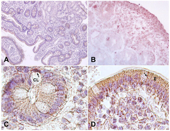 Immunohistochemistry analysis. (A) Immunostaining for Elafin in CD patients showing expression in epithelial cells and in Lieberkühn crypts. Magnification 100×. (B) Elafin immunostaining in epithelial cells. Magnification 200×. (C) Detail of Elafin expression at the level of Lieberkühn crypts (CL). Magnification 400×, (D) Detail of Elafin expression in the cells of the epithelium (E) of the intestinal mucosa and lamina propria. Magnification 400×.