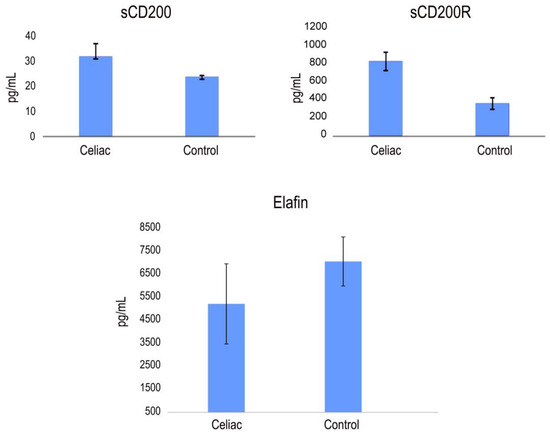 The levels of soluble CD200, CD200R and Elafin in serum of active celiac and non-celiac patients were determined using commercial ELISA kits in accordance with the manufacturer’s instructions (Abcam, Cambridge, UK). For each assay, the standards as well as the samples were tested in duplicate. The cytokine concentrations (pg/mL) were estimated for each assay. The sensitivity of the assays was determined to be >13 pg/mL for sCD200, 12 pg/mL for sCD200R and 1 pg/mL for sElafin, respectively. The concentrations of sCD200, sCD200R and sElafin were quantified from the optical density readings based on standard curves.