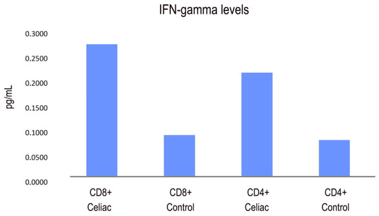 In CD, IFN-γ, primarily secreted by T cells, has the capability to activate tissue transglutaminase 2 (TG2) via the phosphatidylinositol-3-kinase pathway. Conversely, IL-17 and IL-22 serve as regulators, maintaining the integrity of the intestinal mucosa. In CD, the introduction of dietary gluten and the presence of positive TG2 autoantibodies can alter the capacity of intestinal CD4+ and CD8+ T lymphocytes to secrete these cytokines, thereby inducing structural changes in the intestinal tissue. Consequently, both IL-17 and IL-22 may contribute to the development of autoimmune diseases, such as rheumatoid arthritis [41], inflammatory bowel disease [42] and, as observed in our study, in CD.