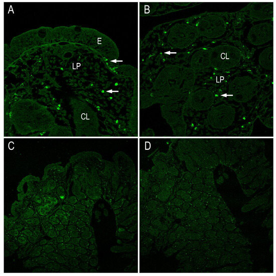 Using immunohistochemistry analysis, we examined the presence of IL-17 and lL-21 in intestinal biopsies obtained from patients with active disease and healthy individuals. The results suggest that IL-21 secretion is likely associated with lamina propria lymphocytes, as there is no evidence indicating that IELs might be also a source of this cytokine (Figure 6B,C). In response to gluten stimulus, IL-21 is produced by lamina propria lymphocytes and it mediates induction of IFN-γ. The distribution of intestinal IL-17+ and IL-22+ cells in the biopsy tissues were immunohistochemically processed and evaluated by confocal microscopy. The results indicate an impaired secretion of both IL-17+ and IL-22+ cells in CD (Figure 6). Also, a significative number of both IL-17- and IL-22-producing cells were found in the small intestinal mucosa.