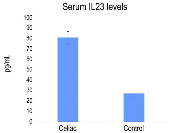 Previously, a role for IL-23-mediated inflammation in the pathogenesis of CD was demonstrated, showing that pepsin-A/trypsin digest of gliadin (PTG) stimulates the production of IL-23 in PBMC from CD patients [31]. We analyzed the presence of IL-23 in serum from CD patients with active disease. The results revealed a pronounced and statistically significant increase in serum levels of IL-23 in celiac patients compared to healthy individuals (Figure 7).