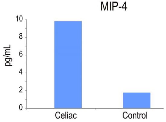 An in vitro enzyme-linked immunosorbent assay for the quantitative measurement of human MIP-4 levels in serum was used. The MIP-4 protein is involved in adaptive immunity due to its capability to attract both CD4+ and CD8+ T lymphocytes [32]. Our results demonstrated that macrophages derived from peripheral blood monocytes exhibited elevated levels of MIP-4 protein expression in CD patients (Figure 8).