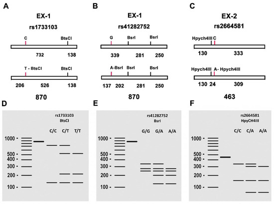 Different aliquots of 20 μL from the PCR reaction product were used for RFLP analysis to genotype the SNPs. For rs1733103 genotyping, 5 units of BtsCI (New England Biolabs, UK) were used in a 40 μL reaction mixture, with incubation performed at 37 °C. For rs41282752 genotyping, 5 units of BsrI (New England Biolabs, UK) were used in a 40 μL reaction mixture, with incubation at 65 °C. Finally, for SNP rs2664581 genotyping, 20 μL of the PCR product fragment, along with 5 units of HpyCH4III (New England Biolabs, UK), were incorporated into a 40 μL for digestion, followed by incubation at 37 °C. The results of the digestions (Figure 9) were visualized by electrophoresis on a 4% agarose gel in 0.5× TBE. Genotyping was performed based on the distinct molecular weight banding pattern obtained in each sample.