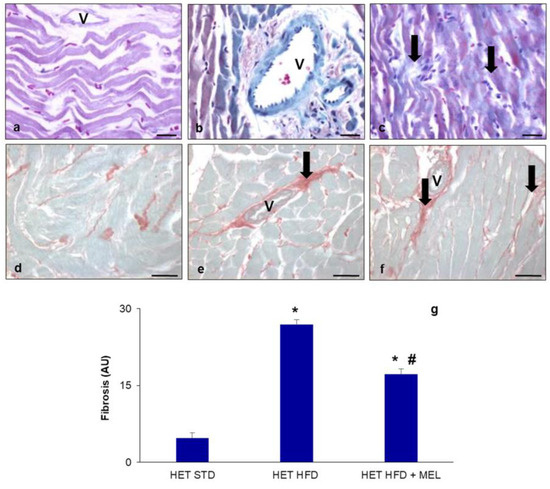 Heart fibrosis. Representative photomicrographs showing perivascular and interstitial collagen deposition (arrows) in the left ventricles of (a,d) HET mice on standard diet, (b,e) HET mice on HFD, (c,f) HET mice on HFD plus melatonin. Masson’s staining (a–c) and Sirius Red staining (d–f). Original magnification: 400× (a–c) and 200× (d–f). Bars = 20 µm (a–c) and 50 µm (d–f). Morphometrical estimation of total heart fibrosis (g). * p < 0.05 vs. HET mice on STD; # p < 0.05 vs. HET mice on HFD. AU: arbitrary units; HET: SIRT1+/−; HFD: high-fat diet (TD 03584-lard 35%); MEL: melatonin; STD: standard maintenance diet; V: coronary vessel.