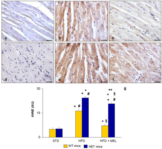 Heart lipid peroxidation. Representative photomicrographs of ventricular cardiomyocyte 4HNE immunostaining in (a) WT mice on standard diet, (b) WT mice on HFD, (c) WT mice on HFD plus melatonin, (d) HET mice on standard diet, (e) HET mice on HFD, (f) HET mice on HFD plus melatonin. Original magnification: 400×, bars = 20 µm. Quantitative analysis of 4HNE immunopositivity indicated the maintenance of toxic lipid peroxidation products in HET mice (g). * p < 0.05 vs. WT mice on STD; # p < 0.05 vs. HET mice on STD; + p < 0.05 vs. WT mice on HFD; § p < 0.05 vs. HET mice on HFD; ** p < 0.05 vs. WT mice on HFD plus melatonin. AU: arbitrary units; HET: SIRT1+/−; HFD: high-fat diet (TD 03584-lard 35%); MEL: melatonin; STD: standard maintenance diet.