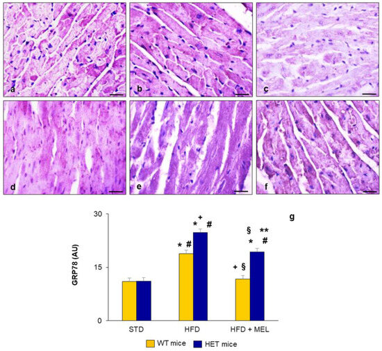 A faint GRP78 signal was localized in the heart of WT and HET mice fed a standard maintenance diet (Figure 3a,d). GRP78 distribution was limited to a few cardiomyocytes in WT mice on an HFD (Figure 3b) and almost absent in WT mice drinking melatonin (Figure 3c). In contrast, GRP78 was significantly enhanced in HET mice on an obesogenic diet (Figure 3e) and was still moderate after melatonin supplementation (Figure 3f). All these findings suggest the occurrence of sustained ER stress in the HET group fed a hypercaloric diet. The morphometrical quantification of GRP78 immunostaining is plotted in Figure 3g.