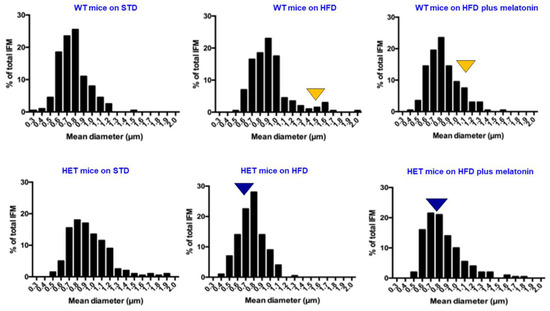 The mean mitochondrion Feret’s diameter was plotted, according to classes ranging from 0.5 microns to 1.2 microns in WT mice and from 0.5 microns to 1.5 microns in HET mice on an STD. Under the lard hypercaloric regimen, the mean mitochondrion diameter exceeded 1 micron (25% frequency) in WT mice, indicating the presence of “mega-mitochondria”. Conversely, in HET mice on an HFD, the mitochondrion diameter was shorter, about 0.8 microns (about 30% frequency). After melatonin intake in WT mice on an HFD, most diameters decreased to 0.7–0.8 microns (60% frequency). In HET mice on an HFD, mitochondrion diameter was maintained at 0.6–0.8 microns (55% frequency), with or without melatonin supplementation.