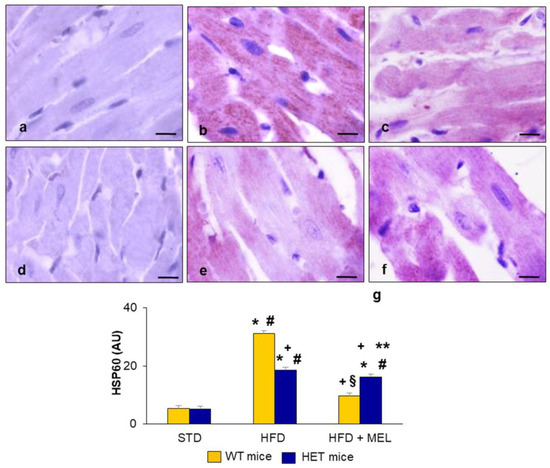 Heart heat shock protein60 expression. Representative photomicrographs of brown HSP60 immunostaining in (a) WT mice on standard diet, (b) WT mice on HFD, (c) WT mice on HFD plus melatonin, (d) HET mice on standard diet, (e) HET mice on HFD, (f) HET mice on HFD plus melatonin. Original magnification: 1000×, bars = 10 µm. (g) Quantitative analysis of HSP60 immunopositivity. * p < 0.05 vs. WT mice on STD; # p < 0.05 vs. HET mice on STD; + p < 0.05 vs. WT mice on HFD; § p < 0.05 vs. HET mice on HFD; ** p < 0.05 vs. WT mice on HFD plus melatonin. AU: arbitrary units; HET: SIRT1+/−; HFD: high-fat diet (TD 03584-lard 35%); MEL: melatonin; STD: standard maintenance diet; WT: wild type.