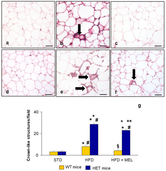 Epididymal adipose tissue crown-like structure analysis. Representative hematoxylin–eosin-stained eWAT photomicrographs: (a) WT mice on standard diet, (b) WT mice on HFD, (c) WT mice on HFD plus melatonin, (d) HET mice on standard diet, (e) HET mice on HFD, and (f) HET mice on HFD plus melatonin. The black arrows indicate the crown-like structures. Original magnification: 400×, bars = 20 µm. (g) Quantitative analysis of crown-like structures in epididymal adipose tissue. * p < 0.05 vs. WT mice on STD; # p < 0.05 vs. HET mice on STD; + p < 0.05 vs. WT mice on HFD; § p < 0.05 vs. HET mice on HFD; ** p < 0.05 vs. WT mice on HFD plus melatonin.