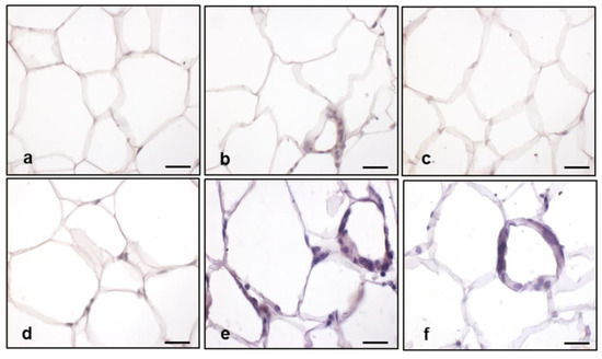 AT paraffin alternate sections were deparaffinized, rehydrated, and stained with hematoxylin–eosin. Nuclear density in iBAT was estimated in hematoxylin–eosin-stained sections digitally imaged and calculated as the total number referring to each digital frame corresponding to 0.04 mm2 (light microscope magnification of 400×) [86]. Fifteen fields were randomly analyzed for each experimental animal. The CLSs in eWAT were counted on ten randomly selected fields (light microscope final magnification of 200×) for five non-consecutive hematoxylin–eosin-stained sections per experimental animal using an image analysis program (Image Pro Premier 9.1, Media Cybernetics, Rockville, MD, USA).