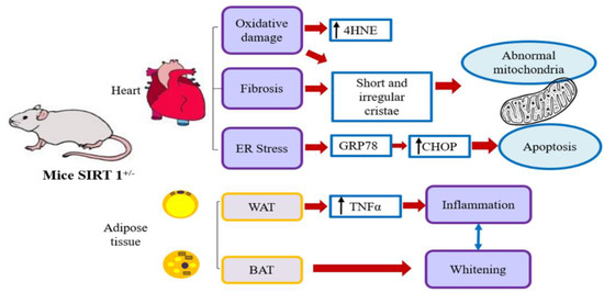 SIRT1-knockout (KO) mice presented developmental cardiac defects, growth retardation, and perinatal mortality [38]. Conversely, heterozygous SIRT1+/− mice survived until adulthood but presented left ventricular dilatation [39]. Studies on adult cardiac-specific SIRT1-KO mice indicated a higher predisposition to adverse changes like diabetic cardiomyopathy, ER stress, and apoptosis [40,41]. By contrast, SIRT1 upregulation alleviated cardiac oxidative damage and diabetic vascular complications [42] even if excessive SIRT1 overexpression induced cardiomyopathy [43]. Similarly, mice carrying an adipocyte-specific deletion of SIRT1 developed insulin resistance and AT inflammation [44].