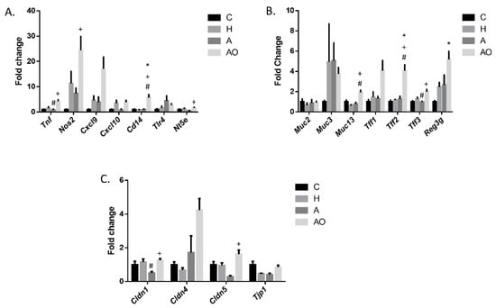 Mucins are a key component in intestinal mucus, protecting the epithelium from bacterial invasion. Together with trefoil factors (TFFs), which are mucin-associated secretory molecules, mucins contribute to the intestinal barrier’s function and are mainly produced by goblet cells. The expression of Muc13 and genes encoding TFF2 and 3 (Tff2 and Tff3) was induced by the addition of fecal waters from AO children to the culture media of mouse jejunum organoids (Figure 1B). A similar pattern was observed for Reg3g (Regenerating family member 3 gamma), whose expression was statistically induced when compared to that of the control (C) organoids. This gene codifies a lectin that is an important component of the intestinal barrier, maintaining the segregation of bacteria from the host. Although there are other Reg3 gamma proteins, Reg3γ is the homolog for human REG3A, which is the one expressed at the highest levels in the human small intestine [13]. No effects of A or H homogenates were observed, except for an inhibition of Tff3 in the A group when compared to the H group (Figure 1B).