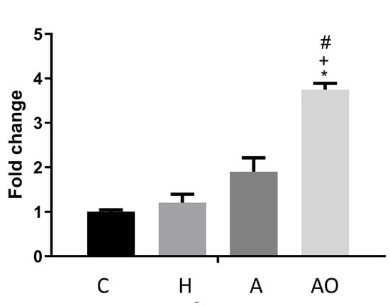 Effect of fecal homogenates of children on the expression of mitochondria-related genes. Fecal homogenates from healthy (H), normal-weight asthmatic (A) and obese asthmatic (AO) children were added to the cell culture medium of mouse jejunum organoids. Three pools of n = 3 and n = 6–7 samples were assayed for the A and AO groups, respectively. qRT-PCR was performed. Results are expressed as mean ± SEM of fold change vs. control medium (C). One-way ANOVA followed by Tukey test was applied. +: p < 0.05 vs. A; #: p < 0.05 vs. H; *: p < 0.05 vs. C.