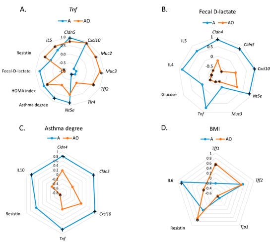 Radial charts for statistically significant correlations between TNF (A), fecal D-lactate (B), Asthma (C) and BMI (D) and parameters assayed in normal-weight asthmatic (A) and obese asthmatic (AO) prepubertal children. Pearson correlation coefficients with correction for multiple comparisons using the Holm–Sidak method are shown. +: p < 0.05 for correlation coefficients in the A group *: p < 0.05 for correlations coefficients in the AO gruop.