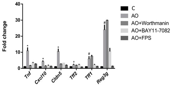 Jejunum intestinal organoids were obtained as previously described [21]. Briefly, jejunum intestinal organoids from wild-type (WT) mice were dissected and incubated for 30 min at 4 °C in PBS with 2 mM EDTA. After shaking, dissociated fragments were passed through 70 µm filter and crypts were counted and centrifuged for seeding. The pellet was resuspended in Corning-Matrigel® (Fisher Scientific, Madrid, Spain) and IntestiCultTM (StemCell, Grenoble, France) with a 1:1 ratio. Domes were cultured in 24 well plates with IntestiCultTM supplemented with penicillin–streptomycin (Sigma-Aldrich). Intestinal organoids were stimulated with 1% (v/v) of fecal water overnight and then processed for RNA extraction. For experiments with inhibitors, 10 µM of BAY11-7082, 10 µM FPS-ZM1 or 1 µM wortmannin (Sigma Aldrich) were added for 24 h and then RNA was extracted as previously described [22,23].