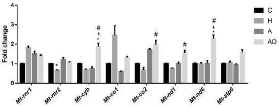 Obesity, and its associated inflammatory process, may lead to an increased production of reactive oxygen species and cause oxidative stress. Moreover, excess nutrient supply can overwhelm the Krebs cycle and the mitochondrial respiratory chain, causing mitochondrial dysfunction that, in turn, increases the production of reactive oxygen species (ROS) and exacerbates the inflammatory process. Since a proinflammatory effect was observed for AO fecal waters, we aimed to study their effect on the expression of genes in the mitochondrial respiratory chain (Figure 5). The expression of respiratory chain genes from complexes I (mt-Nd1 and 6), III (mt-Cyb) and IV (mt-Co1 and 2) was assessed. In addition, mt-Atp6 and mitochondrial 12S and 16 rRNA genes (mt-Rnr1 and mt-Rnr2) were studied. AO fecal waters induced the expression of genes from complexes I and III and of mt-Co2. mt-Atp6 was not significantly induced (the ANOVA p-value was 0.07). Neither were the mitochondrial rRNA genes. No effects of A or H fecal waters were observed, except for the inhibition of the expression of mt-Rnr in the H group.