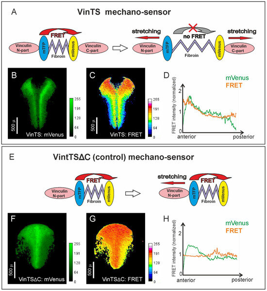To validate the data obtained using the VinTS mechanosensor, we analyzed whether the intensity of expression and uneven distribution of the mechanosensor within the embryo affects FRET. Image analysis showed a low correlation coefficient between the glow intensity in the green and cyan channels (Figure S1A). When comparing the VinTS mechanosensor with the control VinTSΔC, the normalized FRET value turned out to be almost twice as high in the control (Figure S1B). A summary graph of FRET distribution along the anterior–posterior axis clearly demonstrated the presence of a gradient of FRET within the neuroectoderm, whereas in the case of VinTSΔC microinjections, no FRET gradient was observed (Figure 1D,H and Figure S1D).