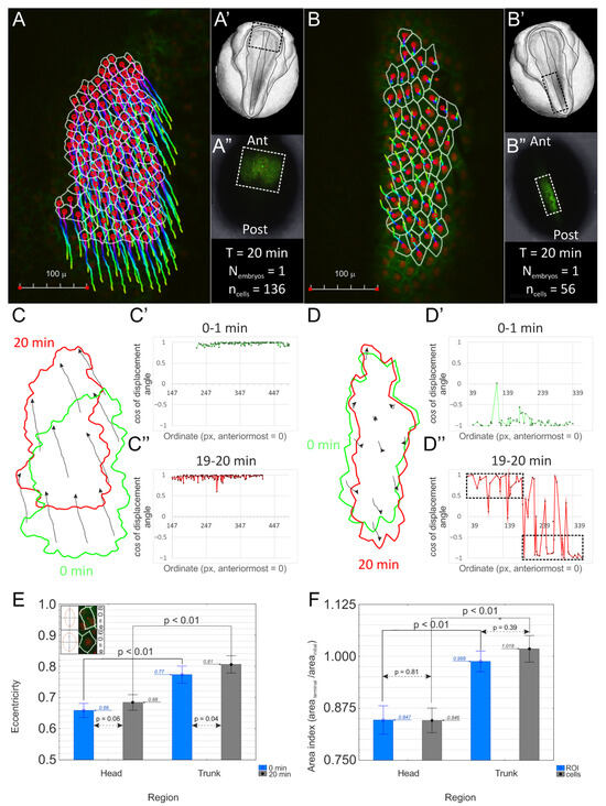 To confirm morphogenetic relevance of reported changes in FRET intensity, we analyzed accompanying tissue deformation, as it may reflect mechanical status of the tissue [16,19,20]. For that purpose, we analyzed time-lapse images of cells in head (Figure 2A) and trunk (Figure 2B) regions of st. 14–15 Xenopus neurula collected during a 20 min interval. We found this time interval sufficient to detect core alteration in cell shapes (Figure S2). We first evaluated tissue-level deformation by analyzing shape change of integral ROIs including all segmented cells (Figure 2C,D). The minor axis of integral ROI was predominantly shortened both in head and trunk regions (12.04% and 13.62% respectively), while the length of the major axis did not change (head region, −0.17%) or was being elongated (trunk region, 13.43%). Cell displacements underlying tissue deformation were also qualitatively different in two regions. In the head region, directions of cells’ displacements were conserved along the entire anteroposterior axis and were headed toward the anterior pole (Figure 2C, black arrows), resulting in uniform spatial distribution of the order parameter (Figure 2C′,C″). This reflects translational shift of the entire region. On the contrary, in the trunk region, we detected spatially bifurcated cell displacements (Figure 2D, black arrows), and spatial distribution of the order parameter was noticeably separated in two successive domains (Figure 2D′,D″, black dotted boxes). At the same time, we found a statistically significant increase in the mean eccentricity of cells during observation only in the trunk region (p = 0.041), while the apical area of the vast majority of cells in this location did not change (Figure 2F). The latter indicates that the reported increase in eccentricity in the case of the trunk region is due to elongation of the cells. This elongation coincides with the predominant orientation of cells’ major axes parallel to the anteroposterior direction, i.e., the direction of presumed stretching (Figure S3D′,D‴).