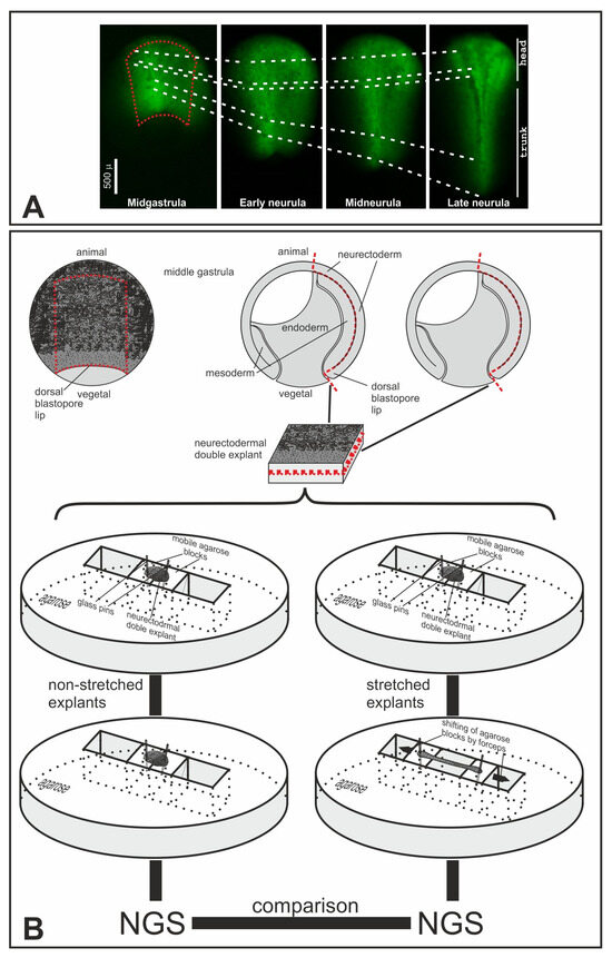 Convergent extension of the neurectoderm and schema of experiments in finding of genes regulated by mechanical tensions. (A) Photos of FLD-injected neural plate at different successive stages of development. White dashed lines connect at different stages the same noticeable features at the embryo surface. The red dashed line on the image of the midgastrula embryo indicates the approximate border of the neuroectodermal explants which had been excised at this stage. (B) Schema of experiments of explants stretching followed by NGS (see main text for details). Red dashed lines indicate the boundaries of the explants.