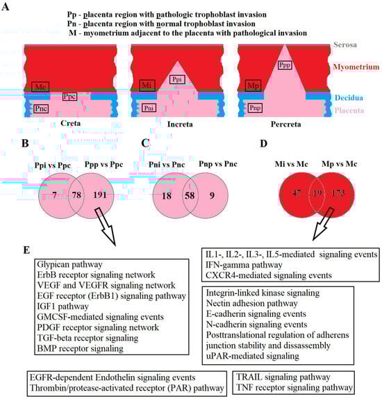 When analyzing experimentally validated target genes of identified here miRNAs differentially expressed in the placenta and myometrium within the PAS site, signaling pathways involving growth factors, glypicans, cell adhesion proteins, integrins, interleukins, and chemokines were identified. These pathways are responsible for processes such as cell adhesion, proliferation, migration, angiogenesis, inflammation, and apoptosis. These data align with discussions in published articles on pathways that stimulate trophoblast invasion [