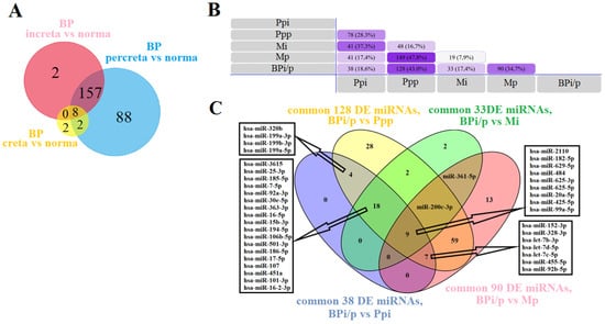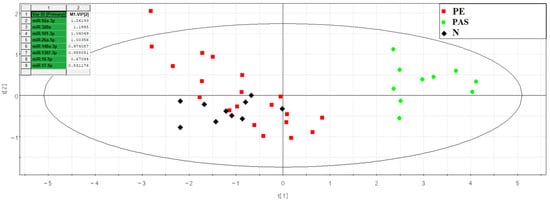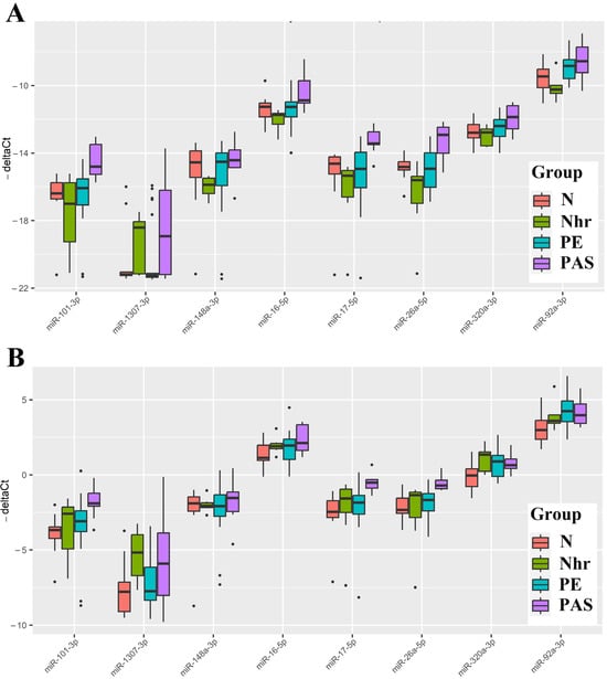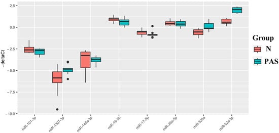 40]. We discovered that the most significant contributors to the differentiation of exosome fractions in the blood serum of women at 11–14 weeks of pregnancy with various types of PAS from combined groups of women with physiological pregnancy and pre-eclampsia, using principal component analysis, were miR-92a-3p, miR-320a, miR-101-3p, miR-26a-5p, miR-148a-3p, miR-1307-3p, miR-16-5p, and miR-17-5p based on deep-sequencing data. Among these, statistically significant differences between the PAS group and all other comparable groups were identified only for miR-320a, miR-92a-3p, and miR-1307-3p based on quantitative real-time PCR data.