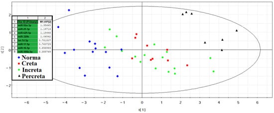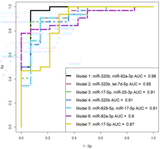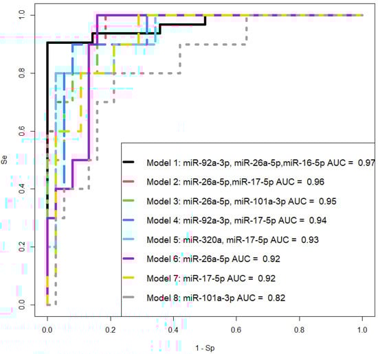 47]. Thus, the involvement of the same miRNA molecules in different diseases necessitates the search for a unique combination of marker miRNAs that can differentiate one pregnancy complication from another. Therefore, when selecting logistic regression models for diagnosing PAS at 11–14 weeks of gestation, we relied on the following criteria: the combination of molecules should include any or all the miRNAs miR-101-3p, miR-26a-5p, and miR-17-5p; all model parameters must be significant, and the model should have high specificity and sensitivity. These criteria are met by two models we developed: the combination of miR-26a-5p and miR-17-5p, and the combination of miR-26a-5p and miR-101-3p, both of which exhibit 100% sensitivity in detecting PAS in women during the first pregnancy screening through their quantitative analysis in native blood serum using real-time PCR.
