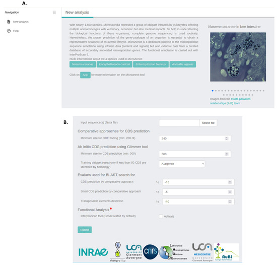 By selecting “New analysis” in the right web banner (Figure 1A), the MicroAnnot tool will display different parameters that can be modulated (Figure 1B). The software takes a flat file containing microsporidian genome FASTA sequence(s) as an input to be annotated (maximum size data 100 Mbytes). The web interface provides the user with the possibility of adjusting the threshold values of the different approaches and softwares used. The user may also select the training dataset for the Glimmer software (version 3.02) when fewer than 50 CDS are identified through the comparative search approach. Functional annotation using the InterProScan software (version 5.60–92.0). is disabled by default but can be enabled by clicking on the “activate” box.