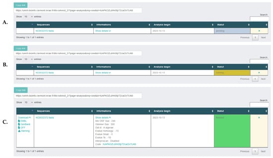 Web interface seen by the user after job submission. (A) pending, (B) running. (C) When the analysis is finished, different file formats (EMBL, GenBank or GFF) are available for download as well as a warning text file grouping uncertain annotations that must be manually validated. At each step, the sequence name (fasta file) is conserved, along with all the analysis details in the information column.